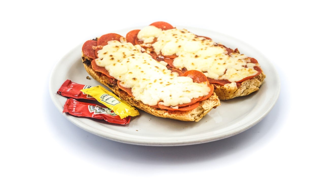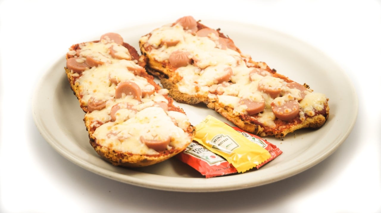 Carne de res, salchciha, champiñones, piña, pepinillos y queso amarillo.