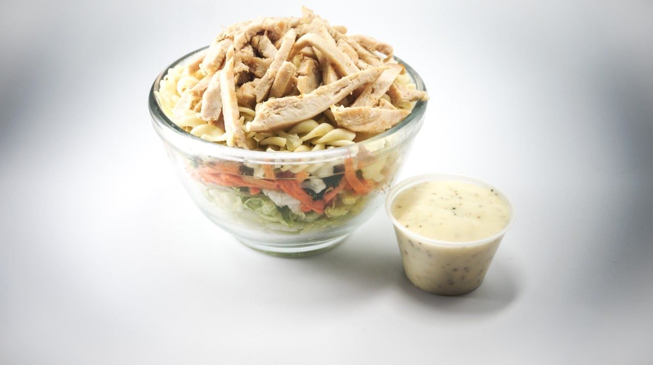 Lechuga mixta, pollo plancha, pasta fusilli, brócoli, coliflor, pepino y zanahoria.