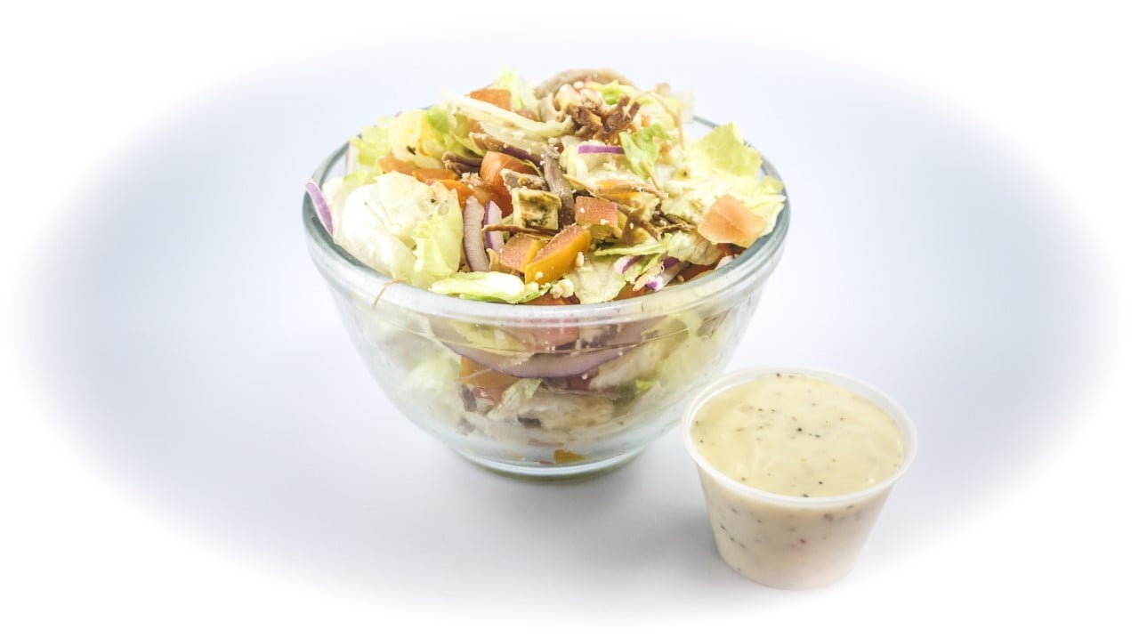 Lechuga mixta, carne deshebrada, jitomate, cebolla morada, queso fresco y vinagreta.