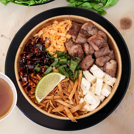 Arrachera jugosa con queso panela, tiras de tortilla, cebollín fresco, chile guajillo y arroz rojo en caldo caliente. Un consomé abundante y sabroso.