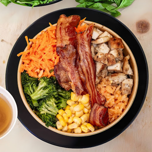 Caldo casero con pollo a la plancha, tocino dorado, brócoli, zanahoria, elote desgranado y arroz rojo. Una opción reconfortante y llena de sabor.