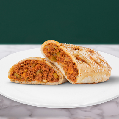 Nuestro tradicional envuelto relleno de atún guisado con una nueva receta estilo vizcaína, con aceituna, tomate y almendra fileteada.