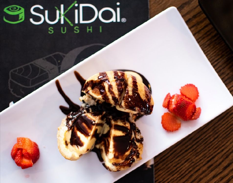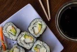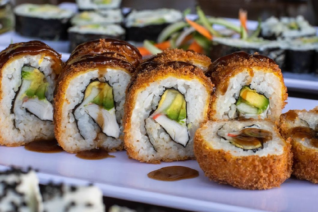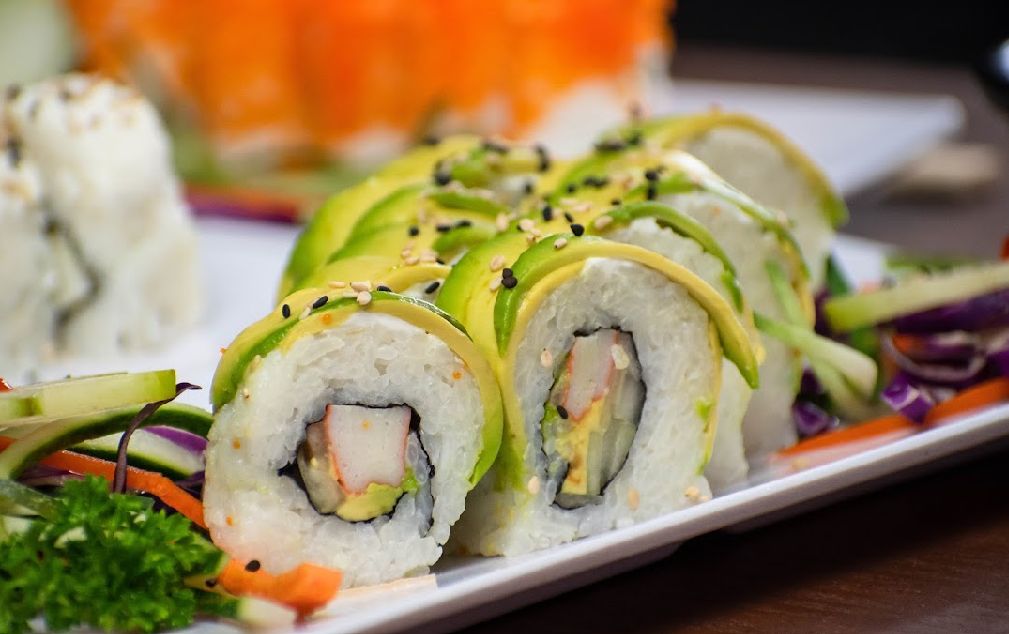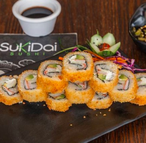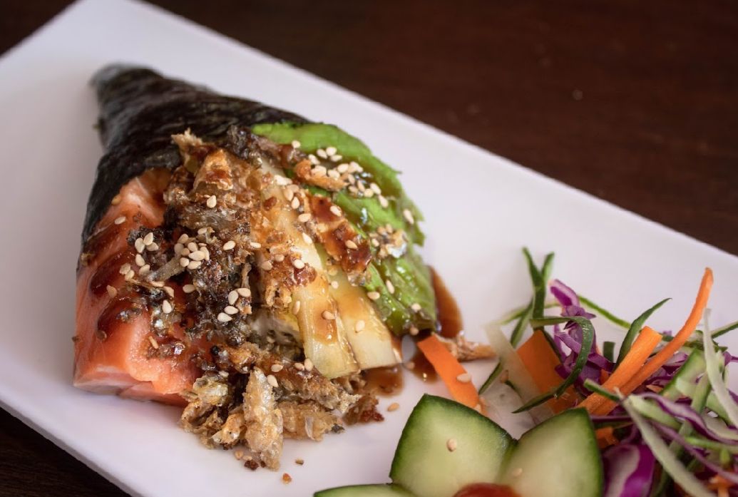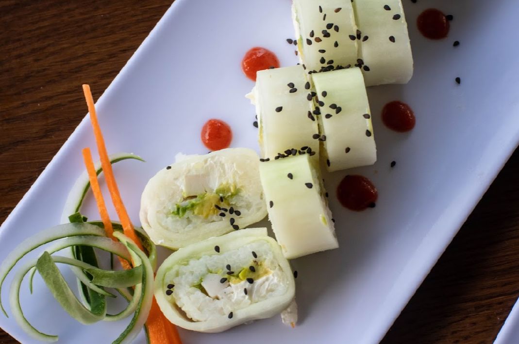 Envuelto en piel de pepino, relleno de kani empanizado, ensalada tampico y bañado en salsa de anguila.