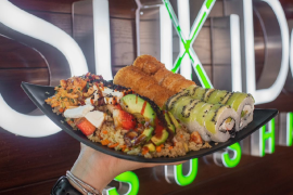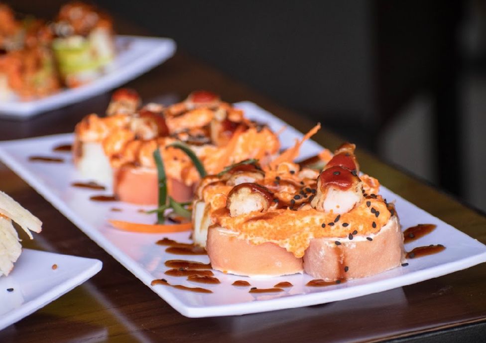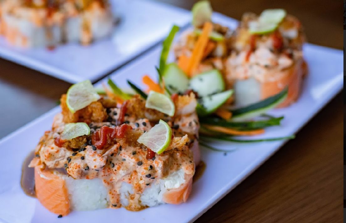 Envuelto en salmón, coronado con spicy agridulce de atún, camarón empanizado y twist de limón.