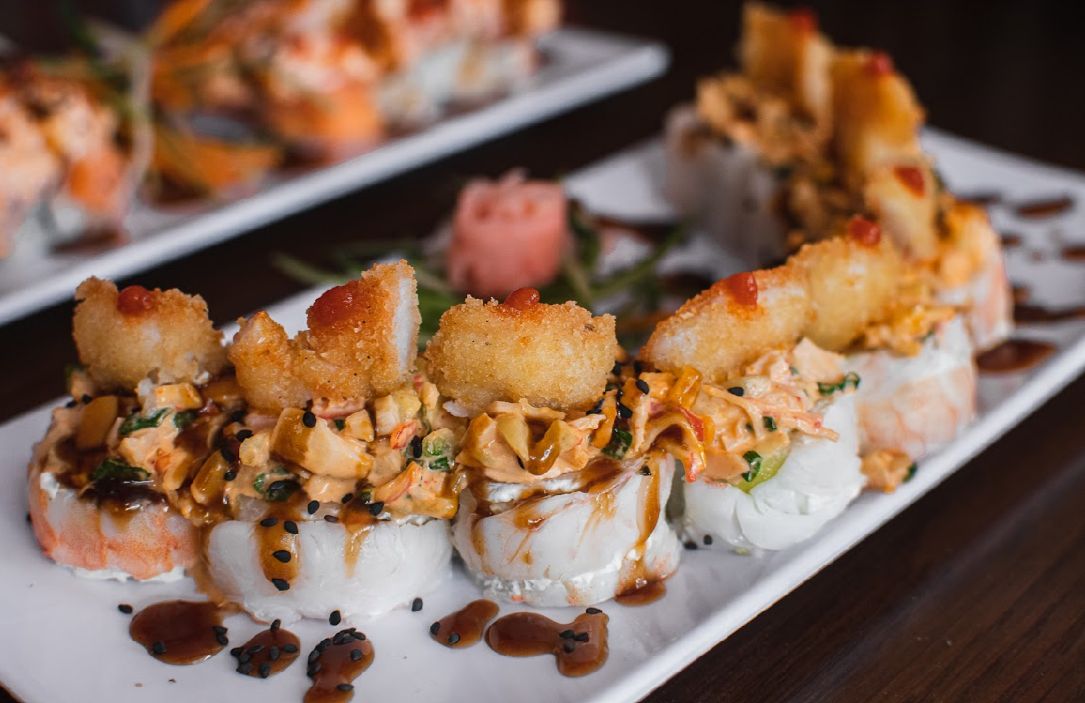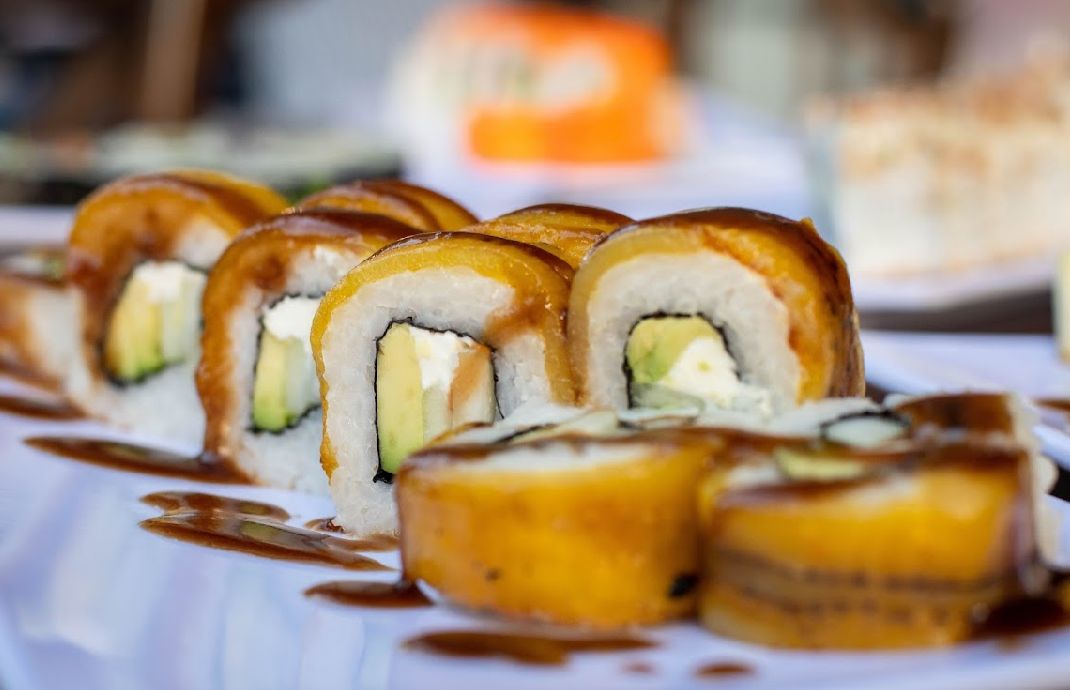 Relleno de camarón empanizado, ensalada tampico y bañado en salsa de anguila.