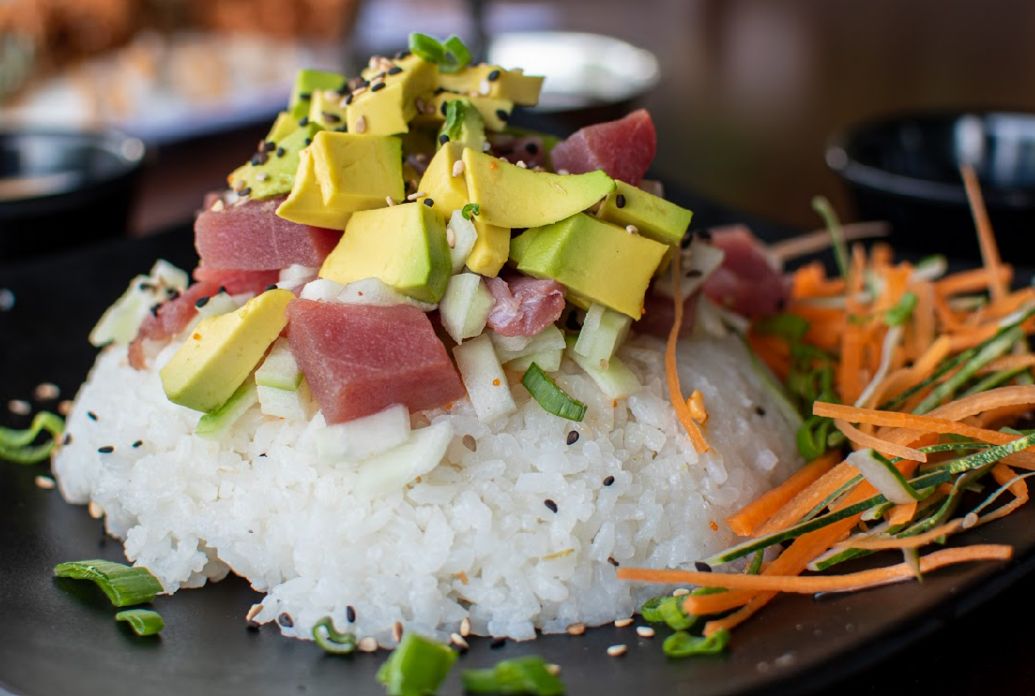 Gohan acompañado con atún fresco, pepino y aguacate.