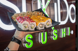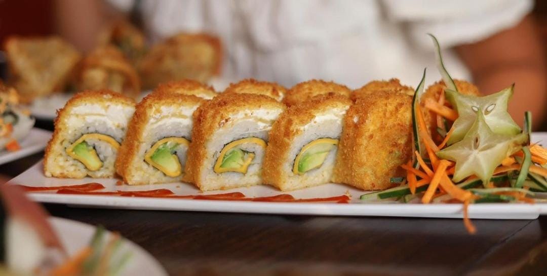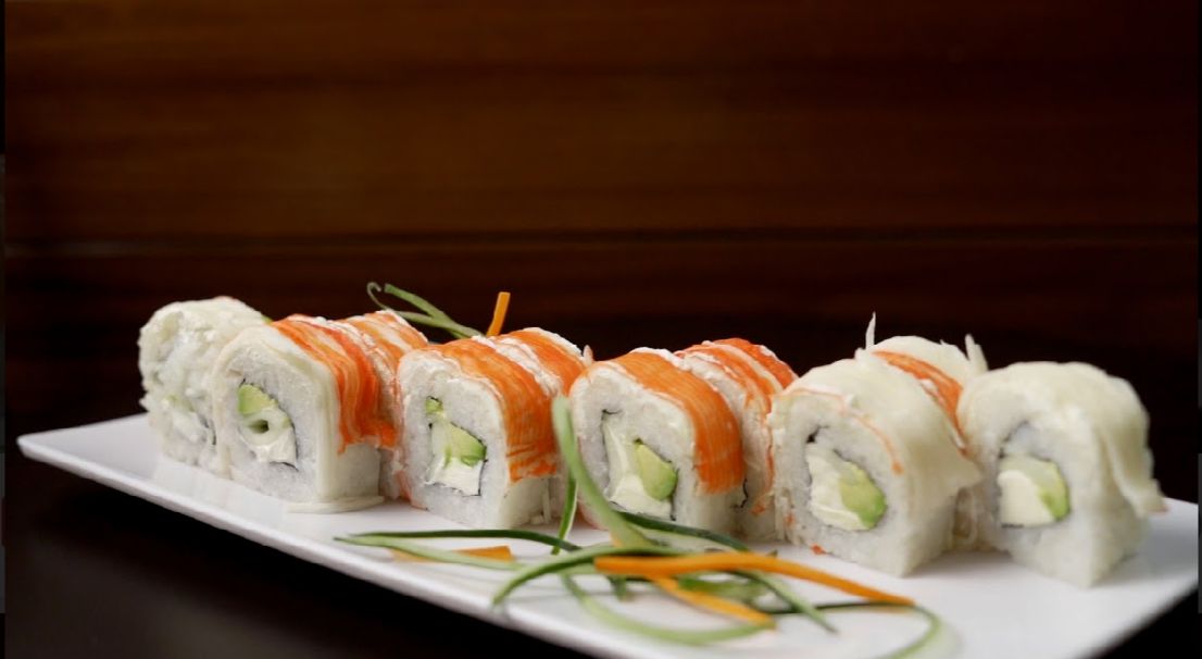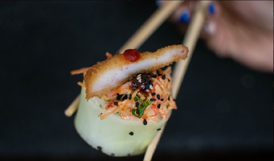 Sushi envuelto en piel de pepino, coronado con ensalada de tampico y trozos de camarón empanizado. Bañado en salsa de anguila.