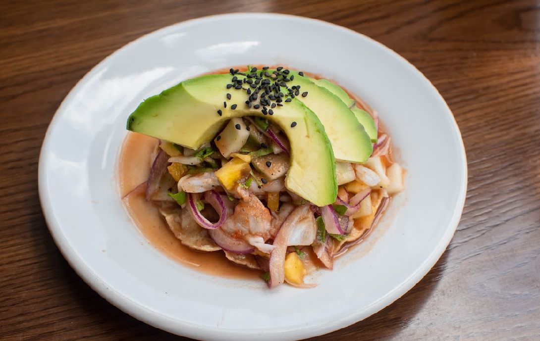 Arroz con mariscos acompañado de aguacate, philadelphia y ensalada tampico.