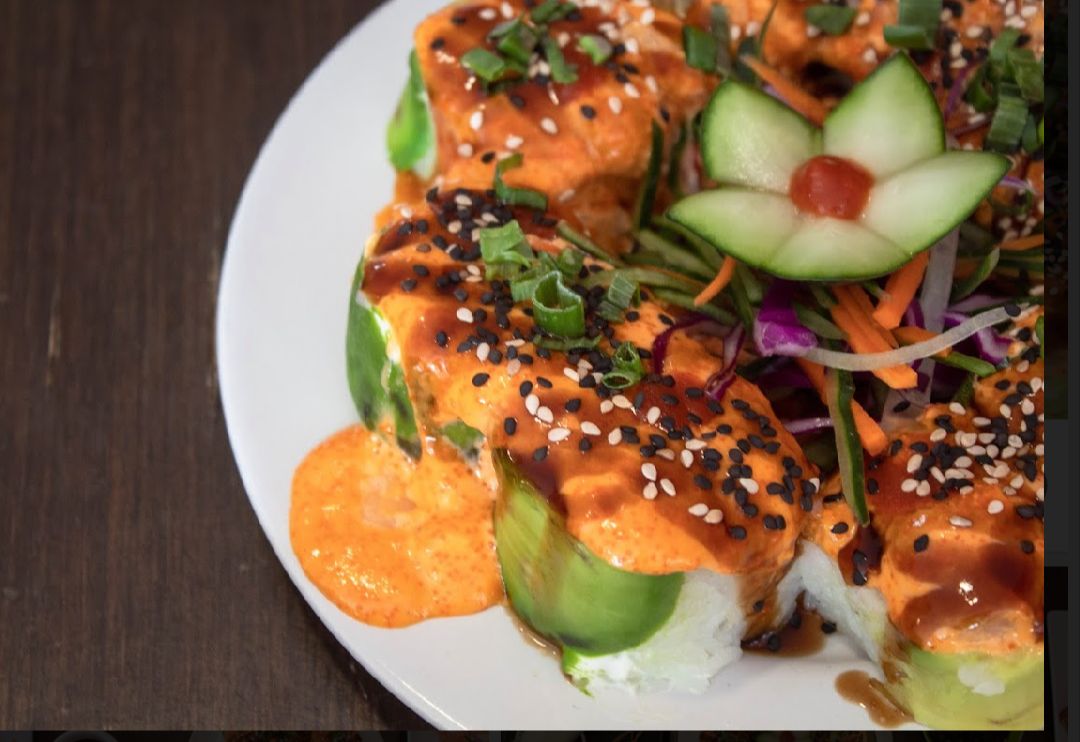 Rollo horneado, envuelto en aguacate, coronado con spicy de kani.
