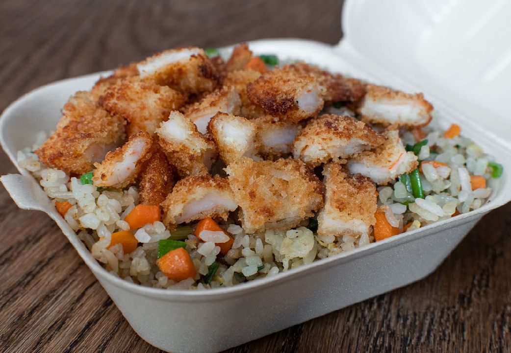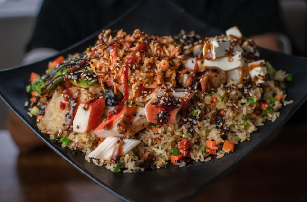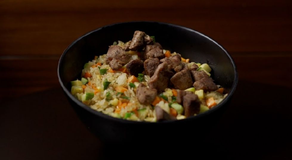 Gohan acompañado con pollo, res y camarón bañado en salsa teriyaki. Acompañado de verduras a la plancha.
