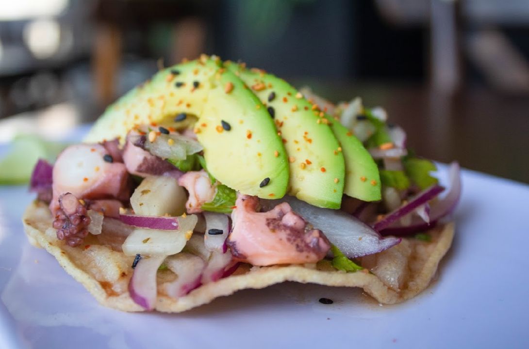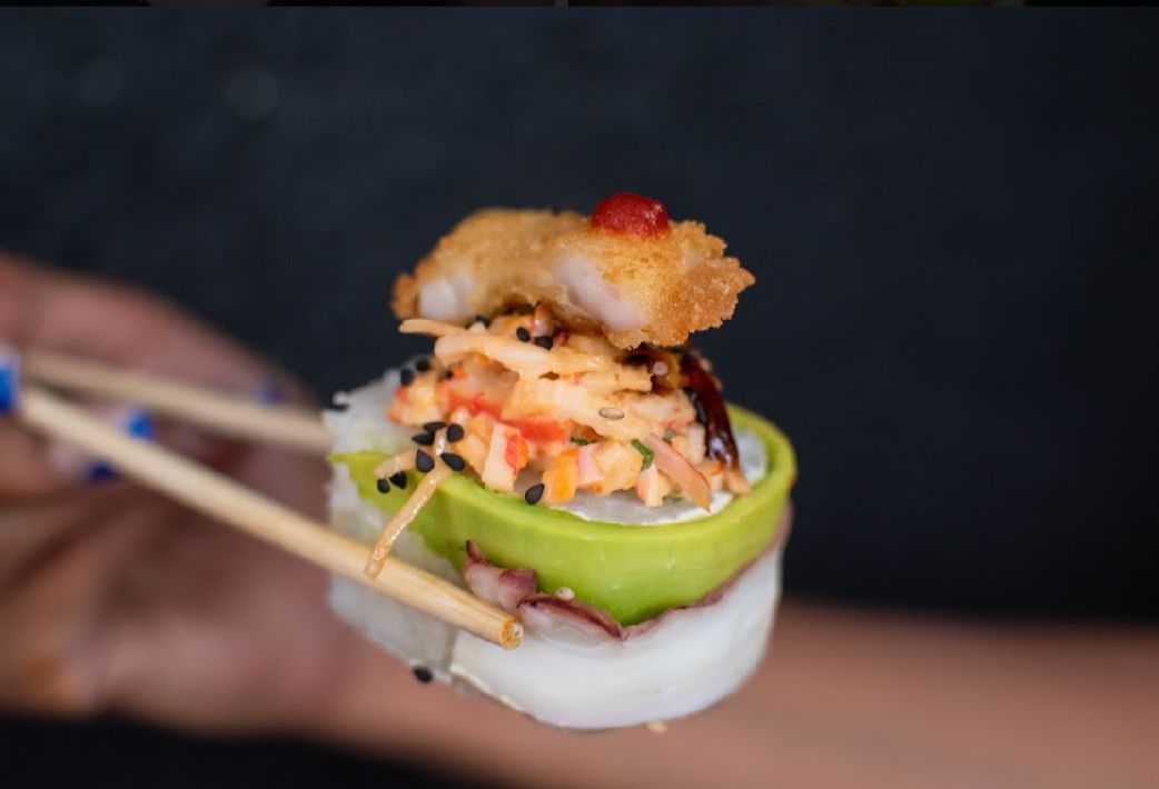 Envuelto en pulpo y aguacate, coronado con tampico y camarón empanizado.