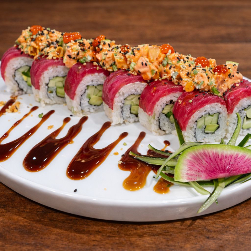 Sushi envuelto en atun coronado con ensaladoa spicy de atun y twist de limon y ajonjoli