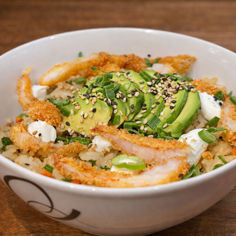 Yakimeshi con Philadelphia, aguacate y camarón empanizado