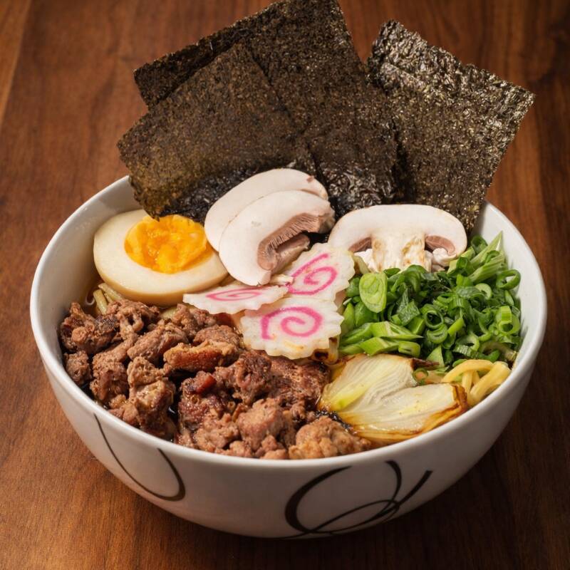 Ramen picoso a base de caldo de cerdo, pasta fresca de trigo, con arrachera, huevo cocido, champiñon, cebolla frita. cebollin, alga y naruto