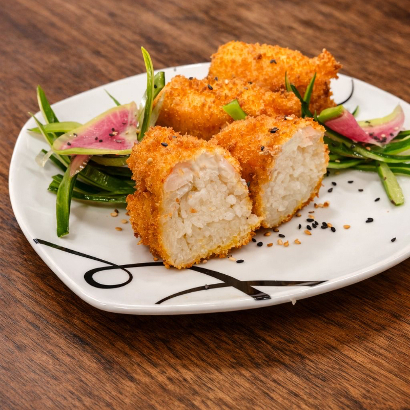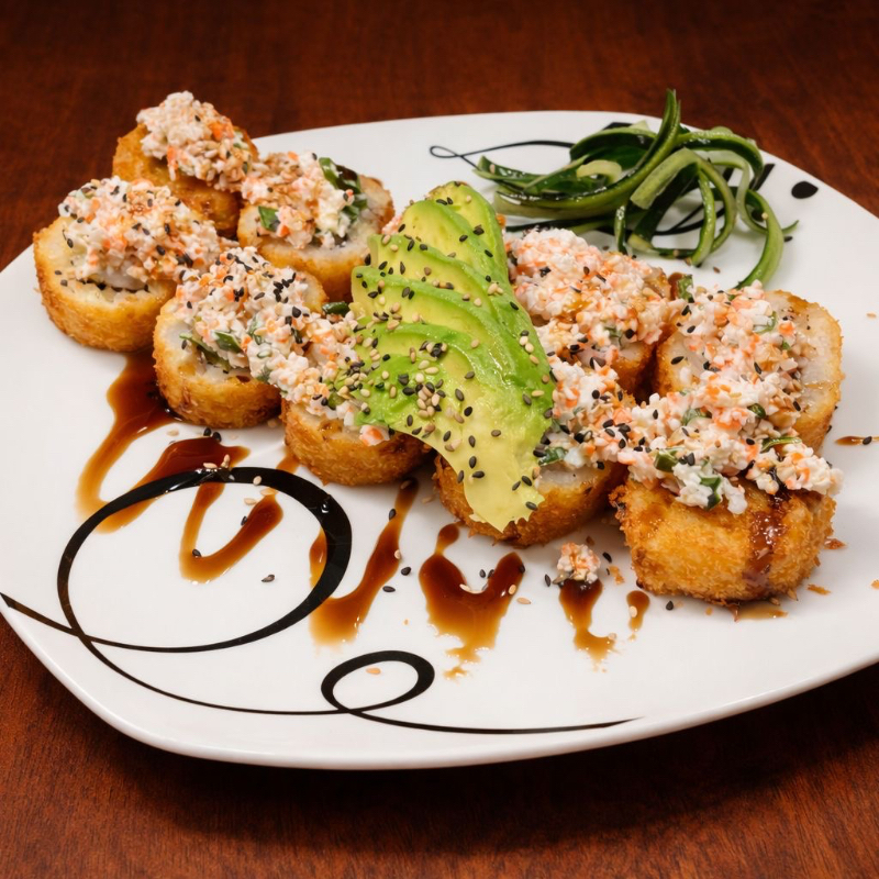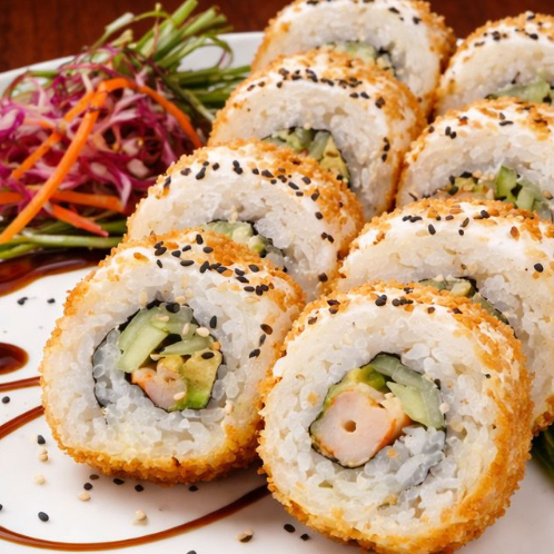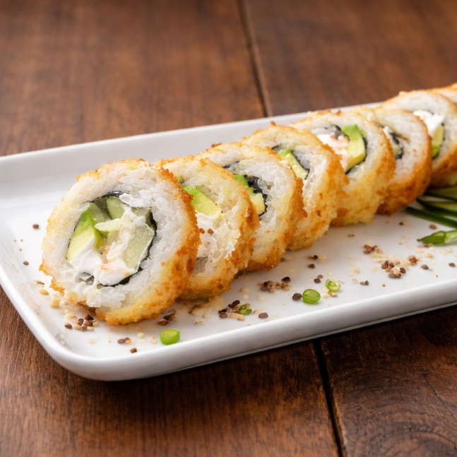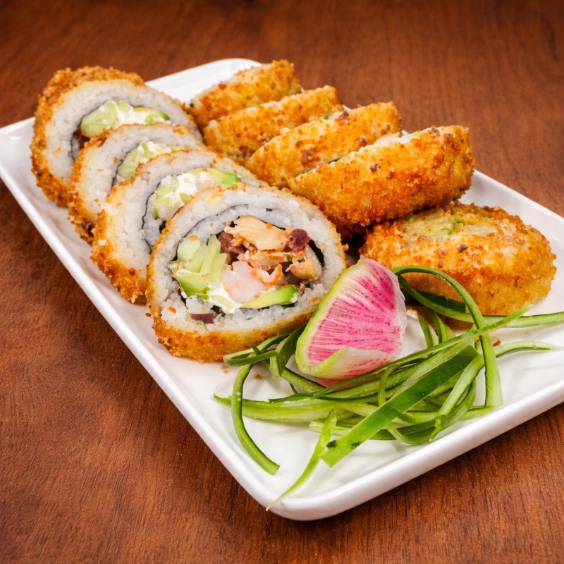 sushi empanizado relleno de arrachera, camarón, philadelphia, pepino y aguacate