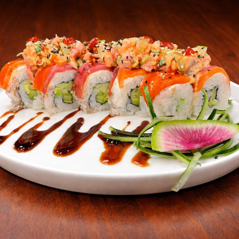 Rollo envuelto en atun y salmon coronado con una ensalada spicy de atun con salmon y twist de limon con un punto de siracha y ajonjoli tostado