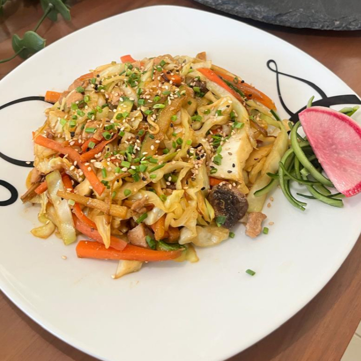 Verduras salteadas con mantequilla, zanahoria, col, calabaza, champiñón, germinado de soya y camarón, arrachera y pollo