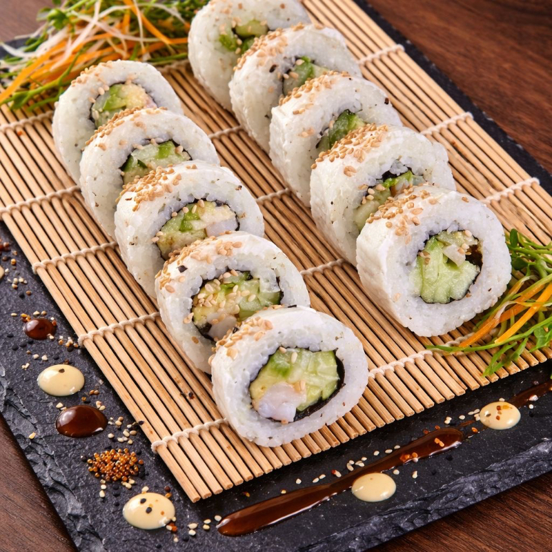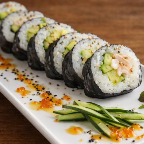 Sushi envuelto en alga relleno de camaron, philadelphia, pepino y aguacate
