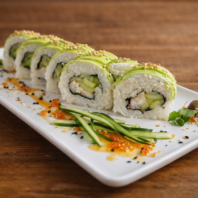 Sushi envuelto en aguacate, relleno de camarón y pepino