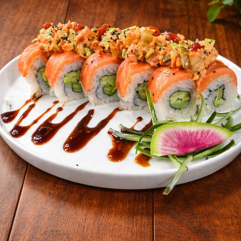 Rollo envuelto en salmon coronado con una ensalada spicy de salmon, twist de limon y ajonjoli