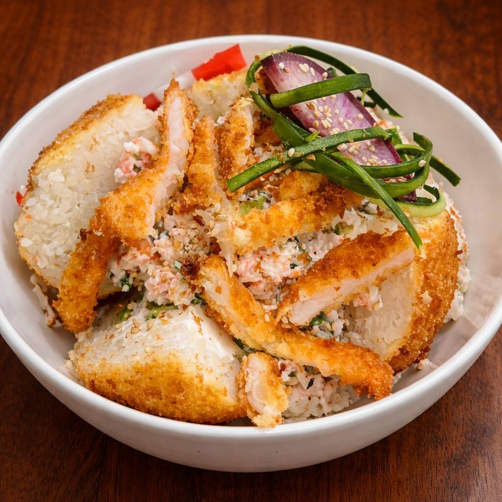 Sushi empanizado coronado con ensalada tampico y camaron empanizado