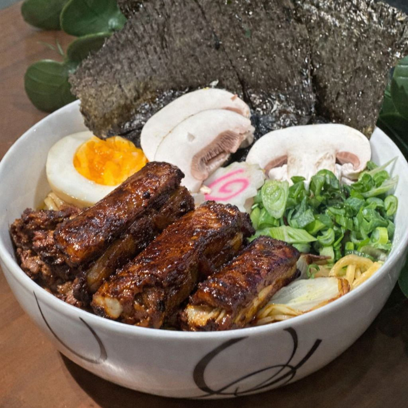 Ramen de costilla PICOSO a base de caldo de cerdo, pasta fresca de trigo, con costilla de cerdo, huevo cocido, champiñon, cebolla frita. cebollin, alga y naruto