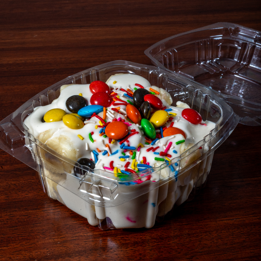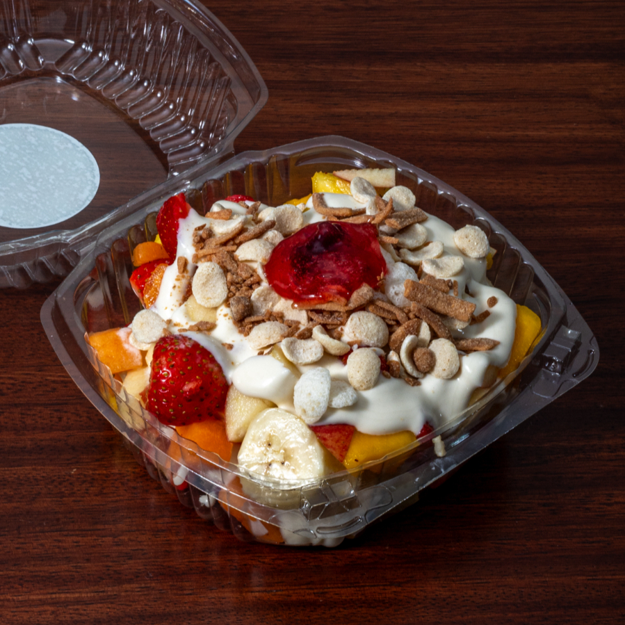 Fruta picada, platano, fresa, papaya, manzana, uva, mango, pera, piña, guayaba, melon; bañadas con nuestra crema especial.