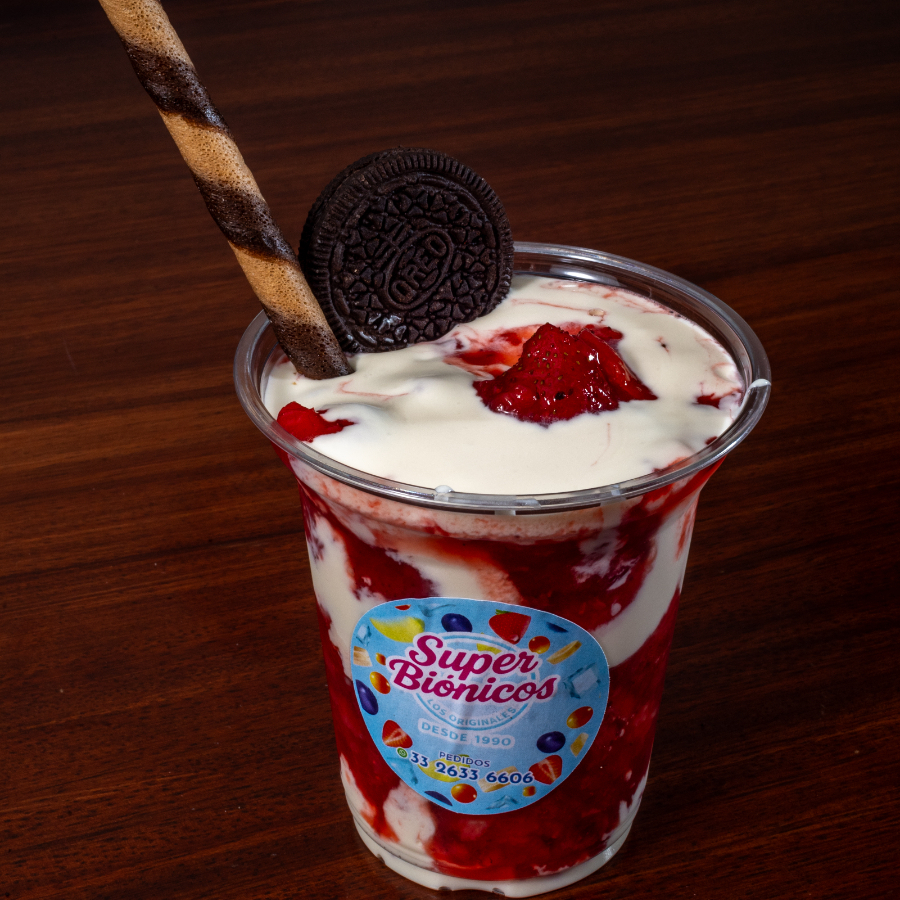 Fresas molidas bañadas con crema de bionico.