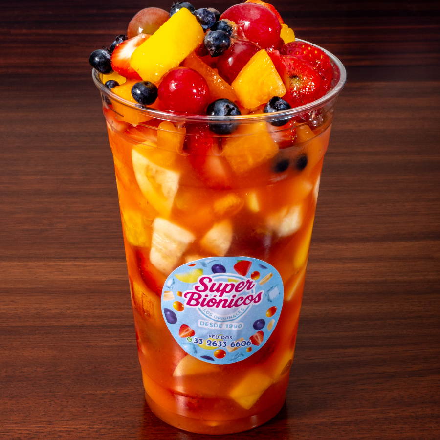 Coctel de frutas con jugo natural de naranja. Platano, Fresa, Papaya, Manzana, Uva, Mango, Pera, Piña, Guayaba, Melon.