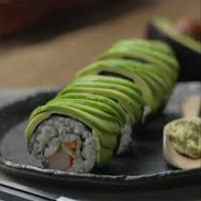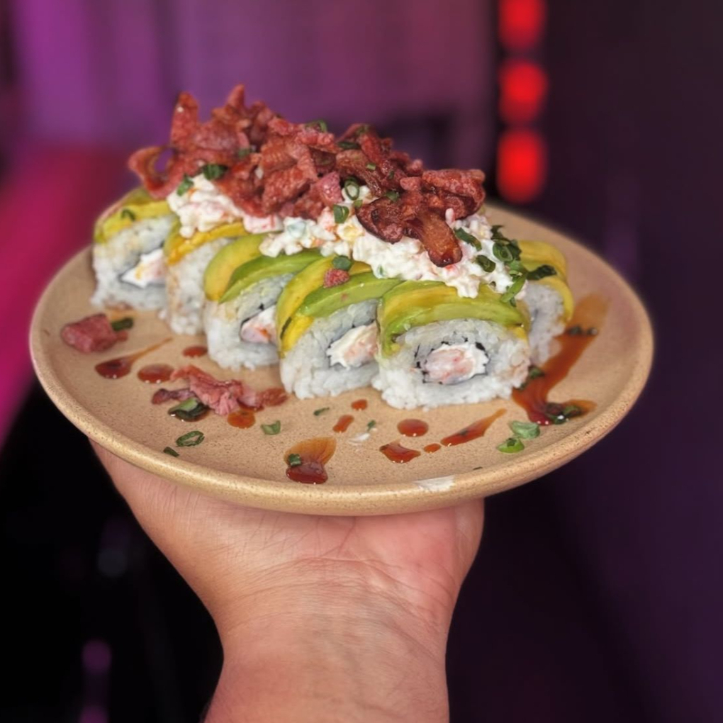 Rollo cubierto con lamias de aguacate fresco con topping de ensalada tampico y trocitos de tocino crujiente