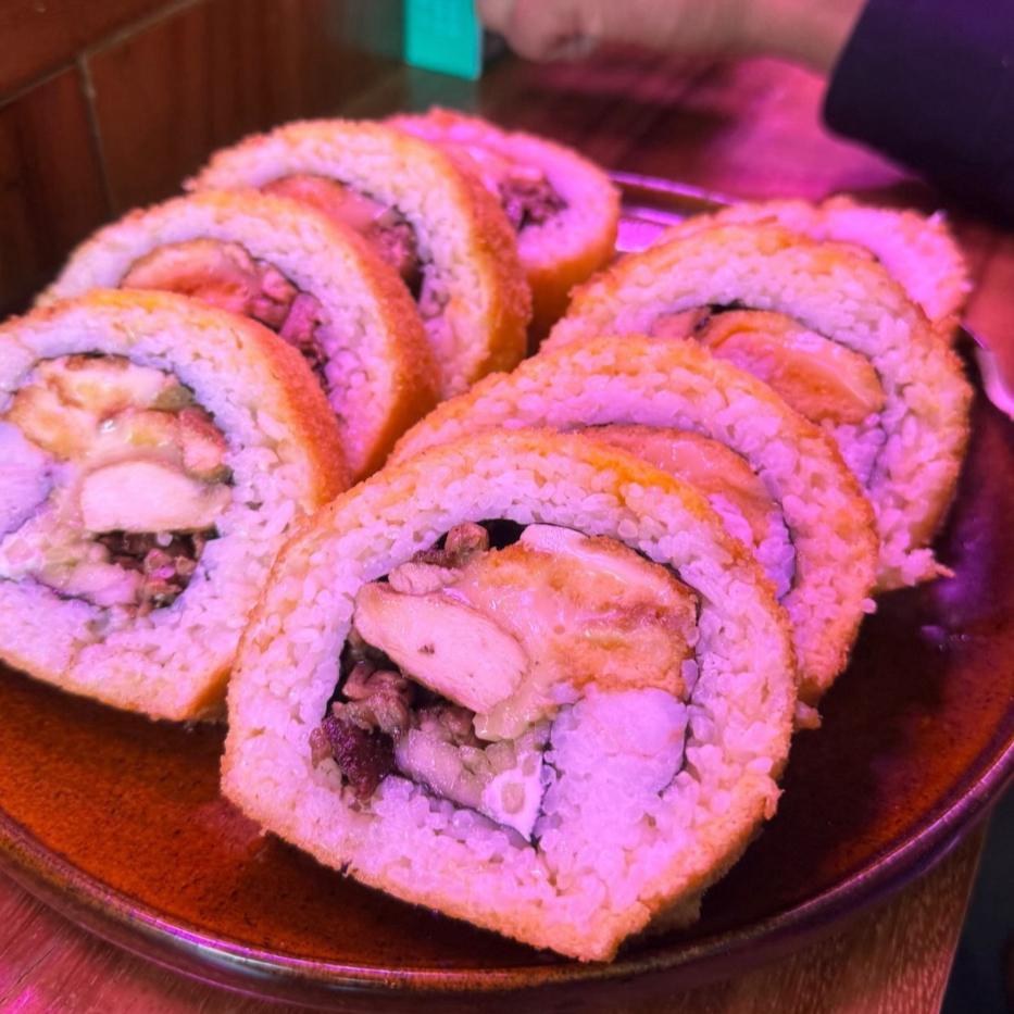 Rollo empanizado , relleno de pollo , aguacate, philadelphia , coronado con tocino crujiente y aderezo de chipotle