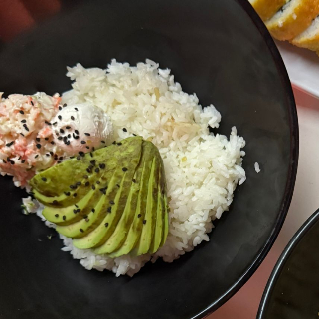 Arroz blanco al vapor acompañado con ensalada tampico, aguacate y philadelphia