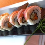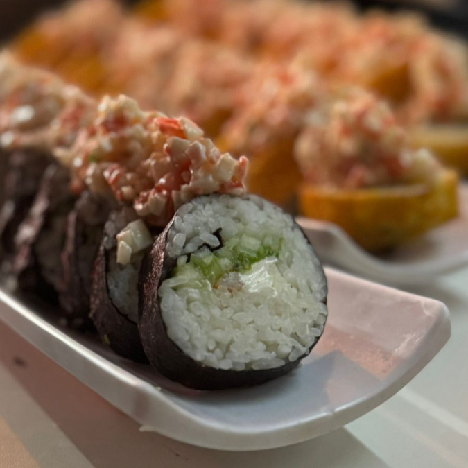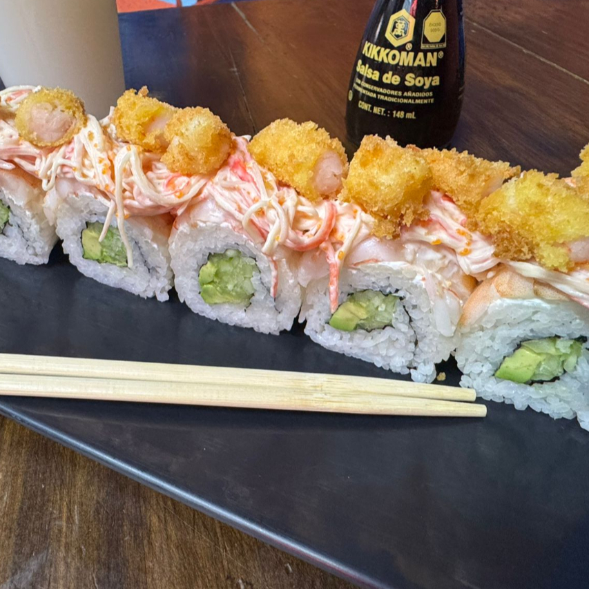 Por fuera cubierto por camarones, con un topping de ensalada de kanikama y camarones empanizados, por dentro, aguacate, pepino, philadephia y alga