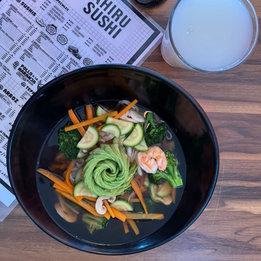 Sopa japonesa con fideos gruesos acompañada de verduras y camarón