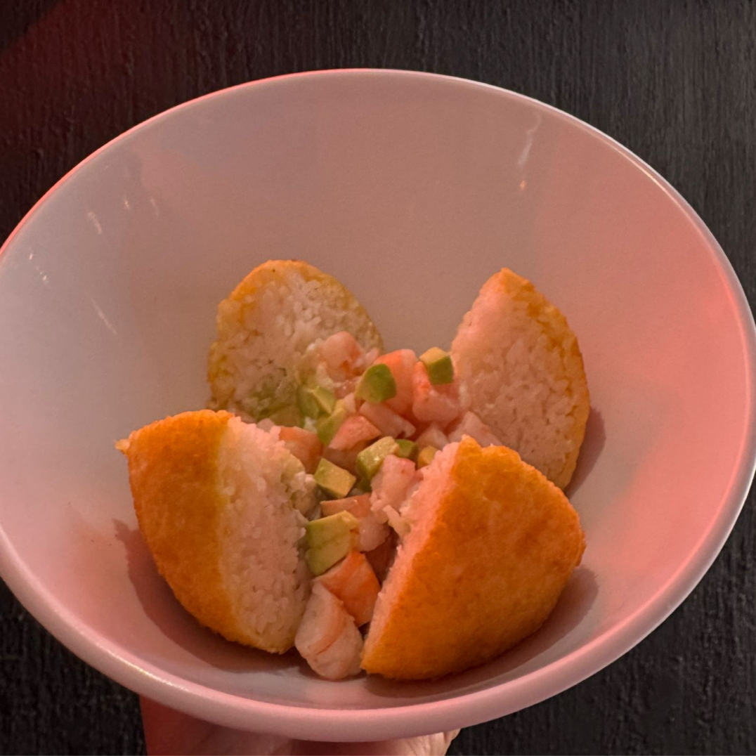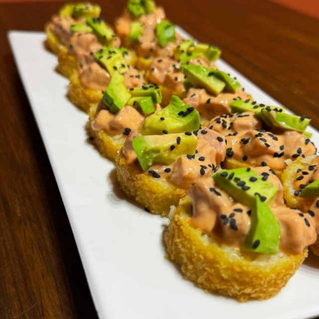 Empanizado de camarón, coronado con topping de atún fresco spicy y ajonjolí