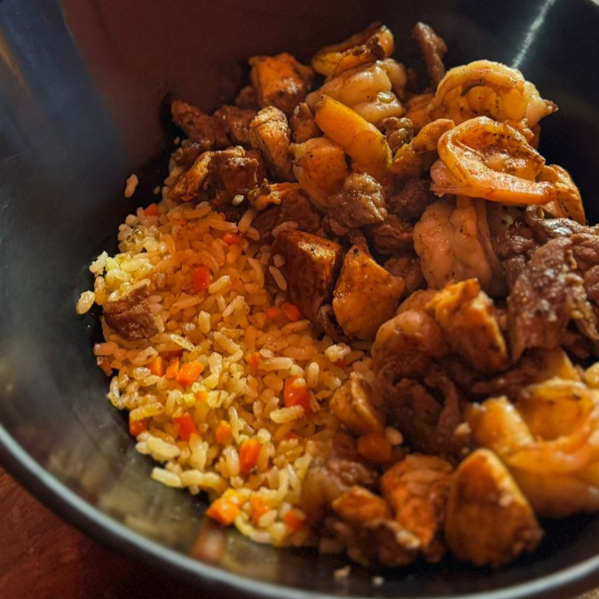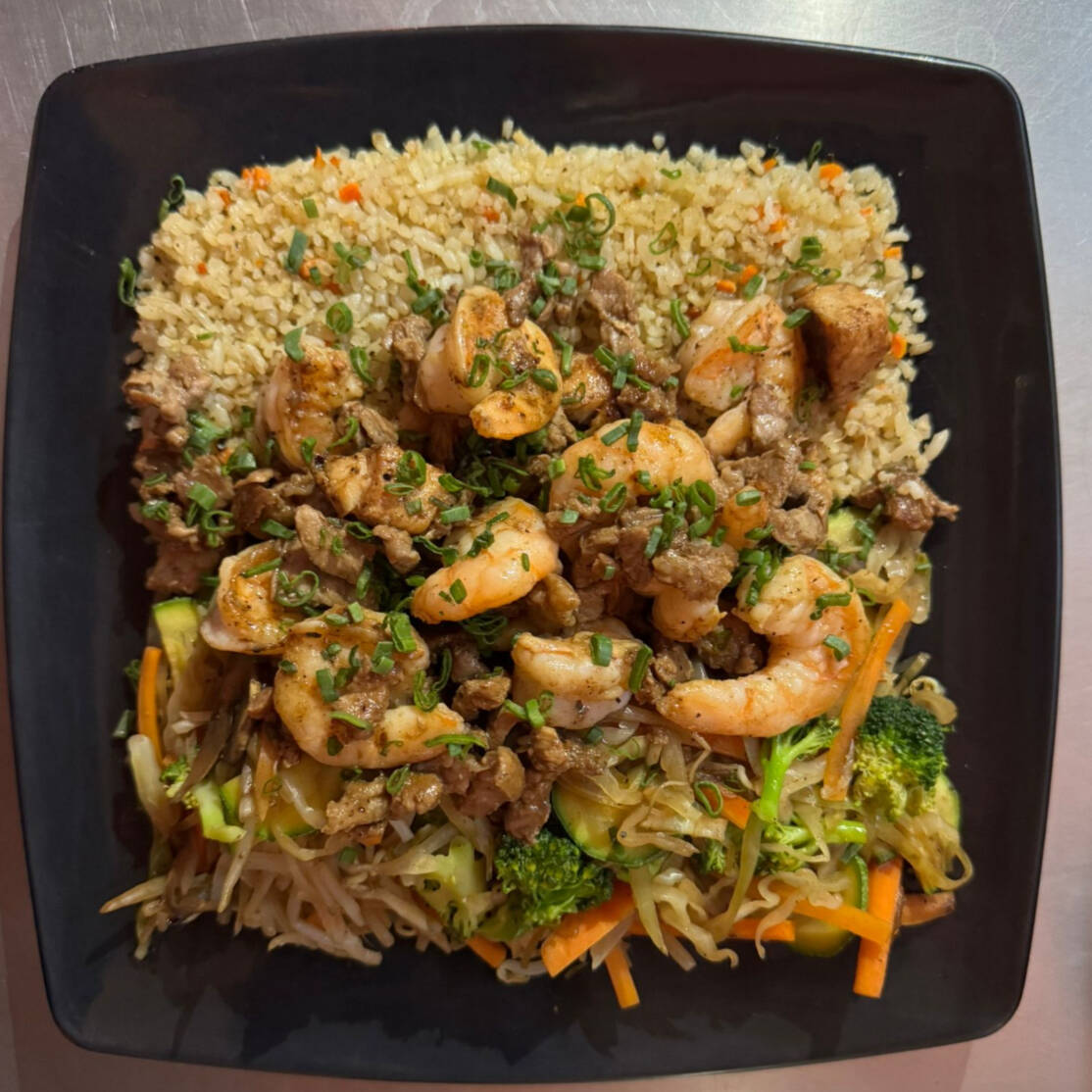 Verduras al vapor acompañadas de arroz frito y la proteína de tu elección