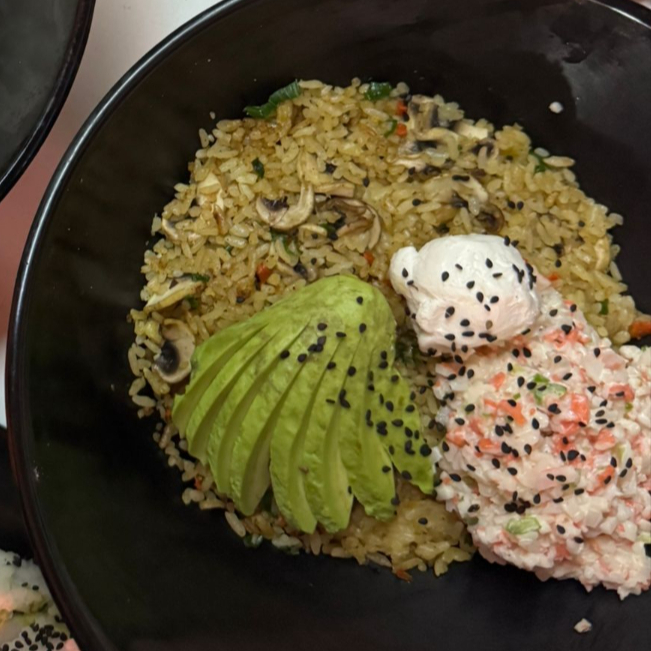 Arroz frito, con queso gratinado, champiñones, acompañado de ensalada tampico, philadelphia, y aguacate
