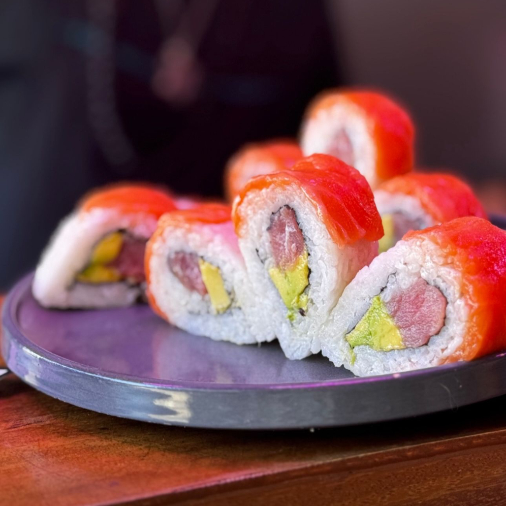 Rollo cubierto por laminas de atun fresco y philadelphia, por dentro camarón, aguacate y pepino