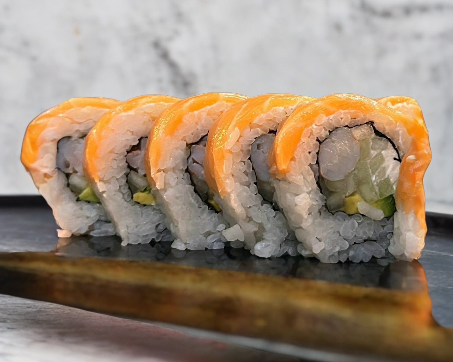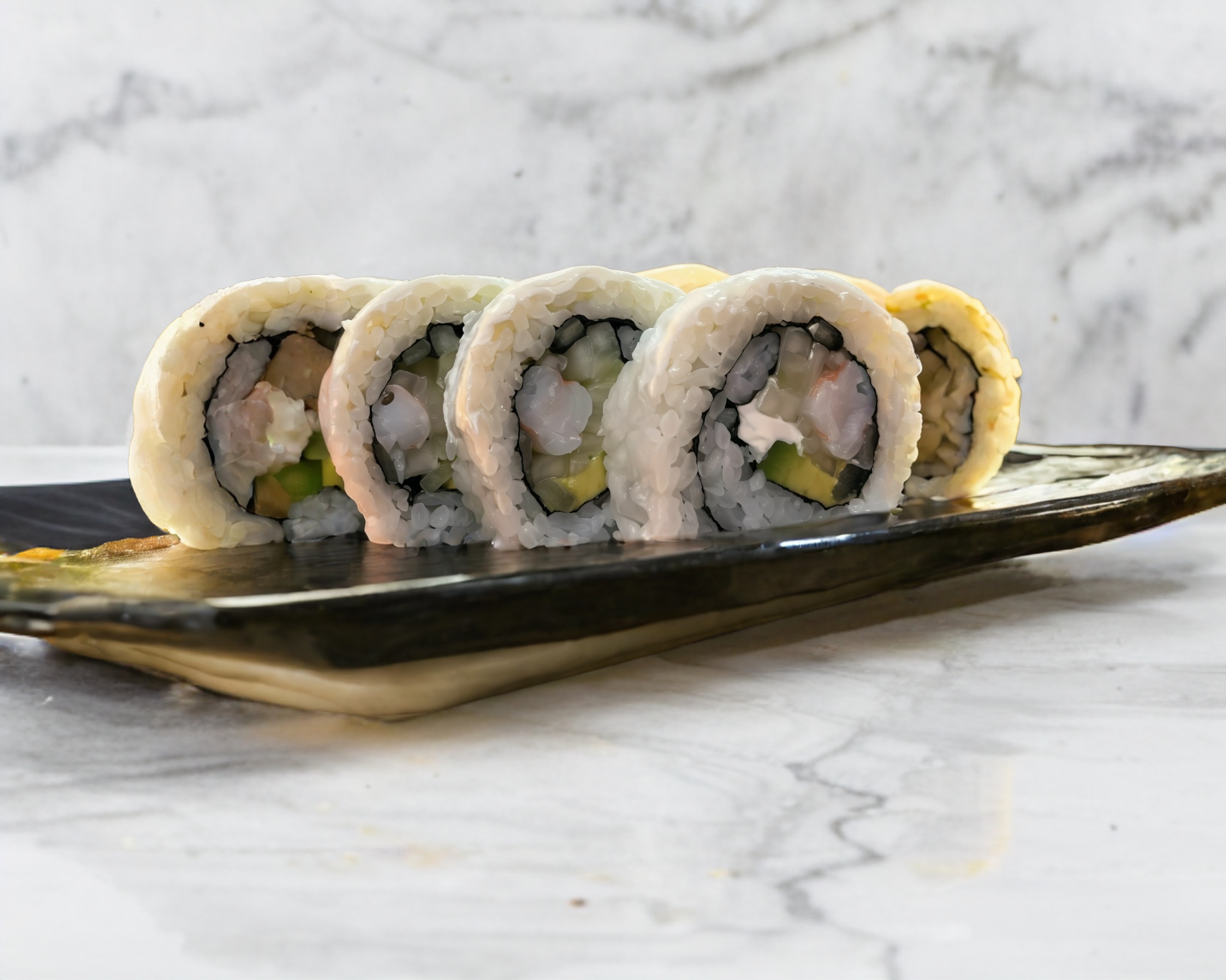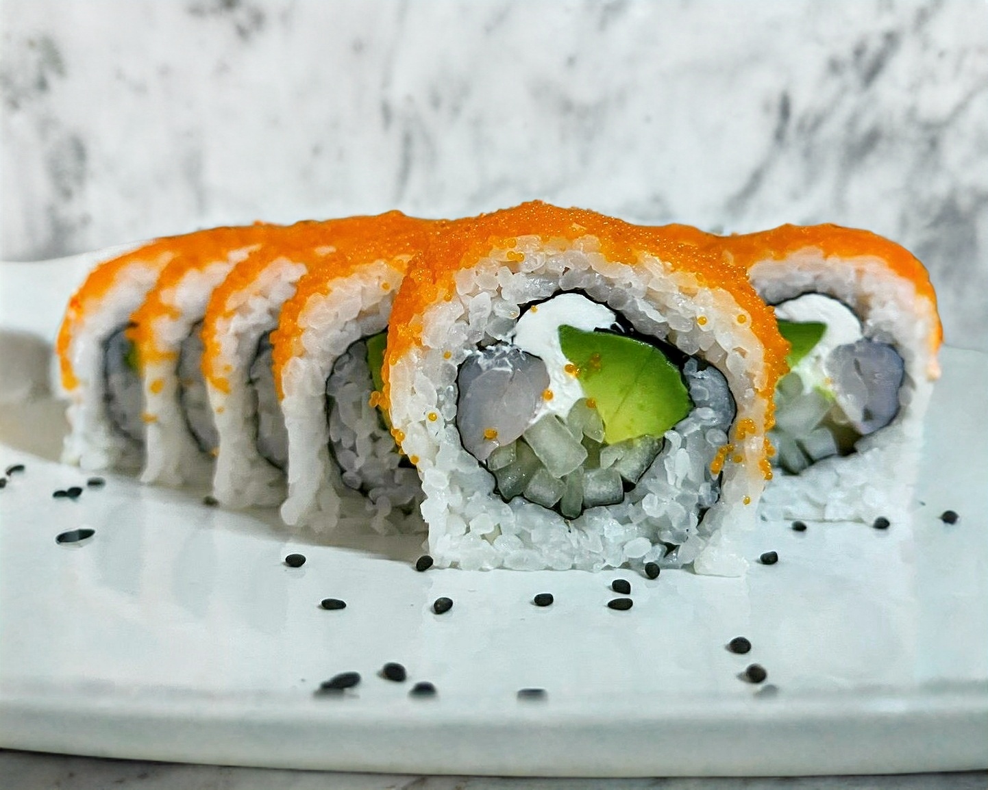 Forrado con 4 mariscos, aguacate, masago y ajonjoli