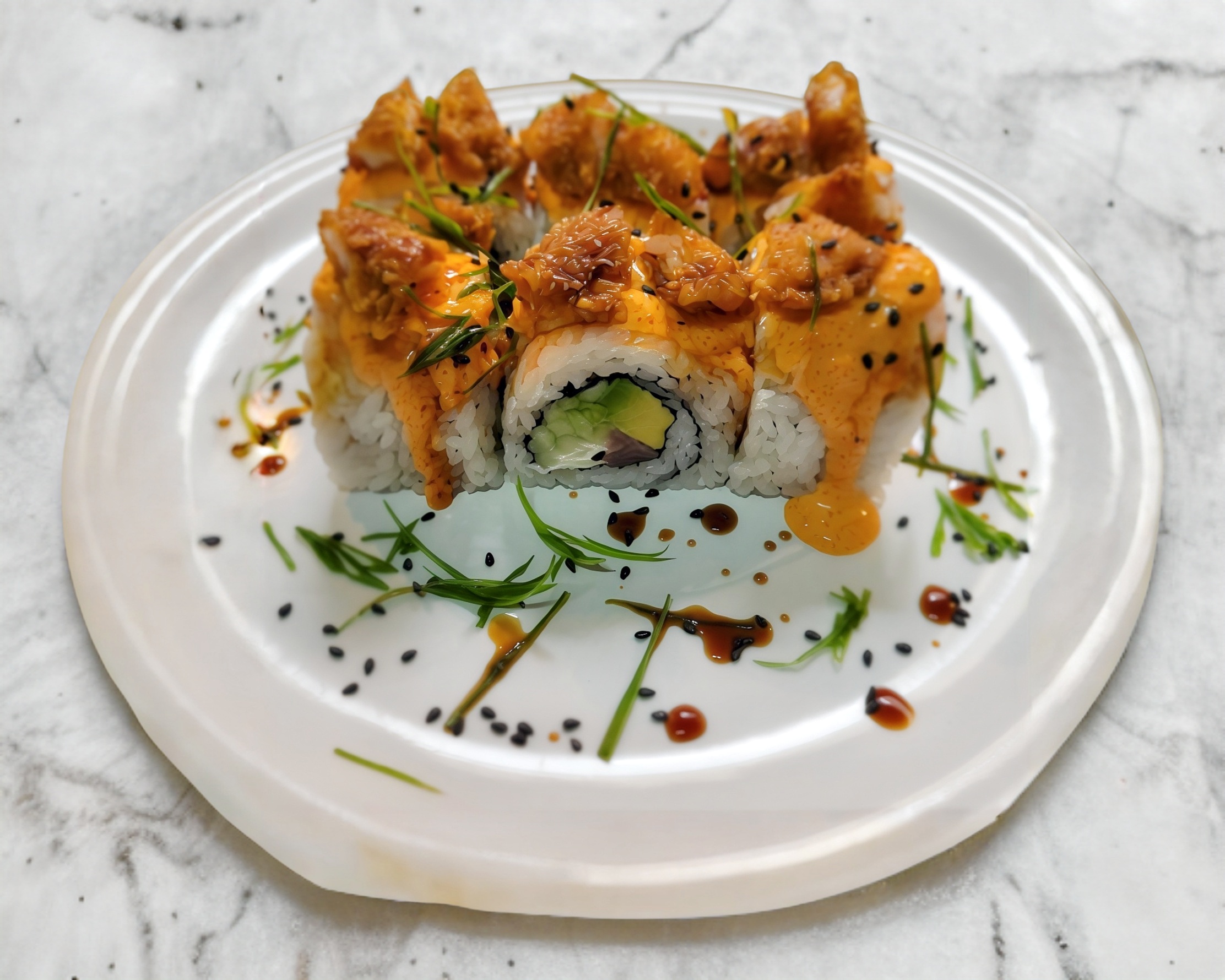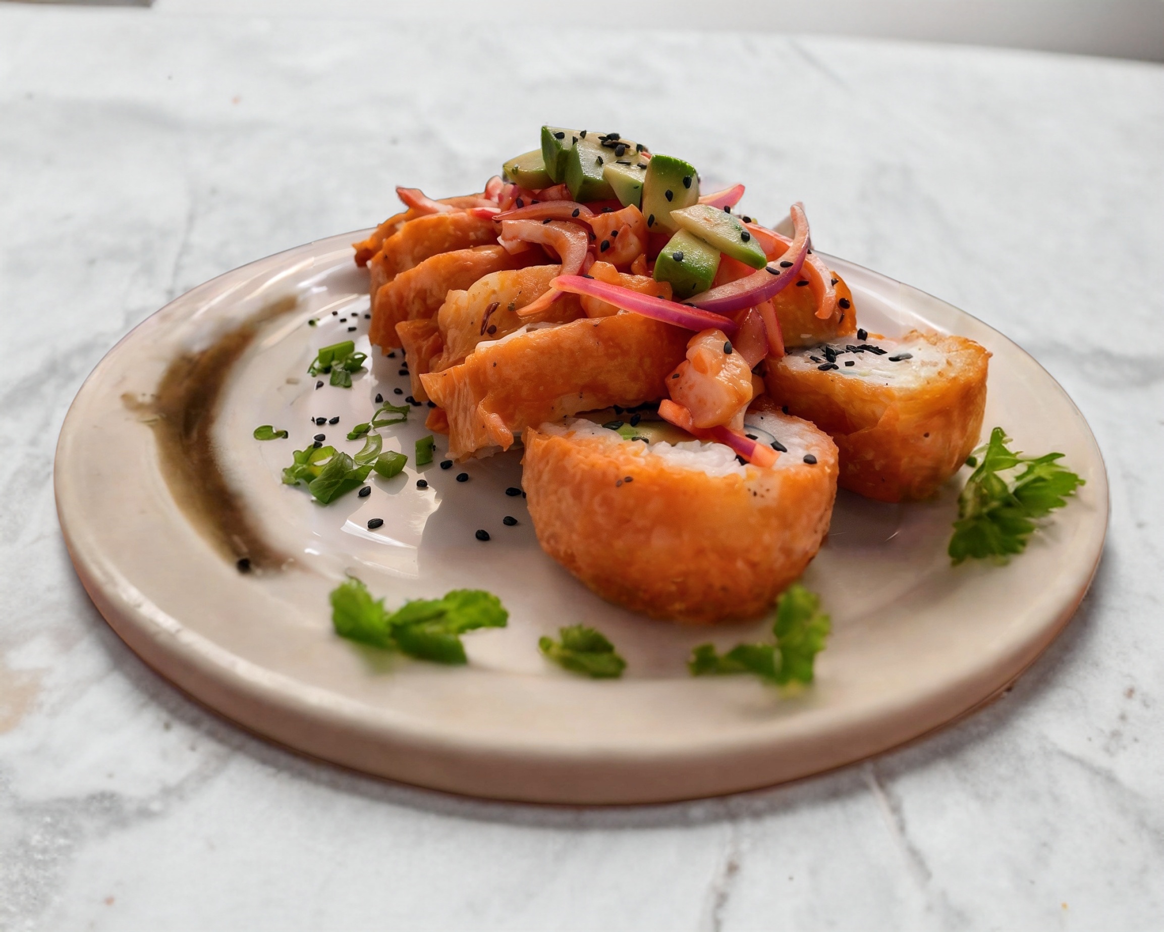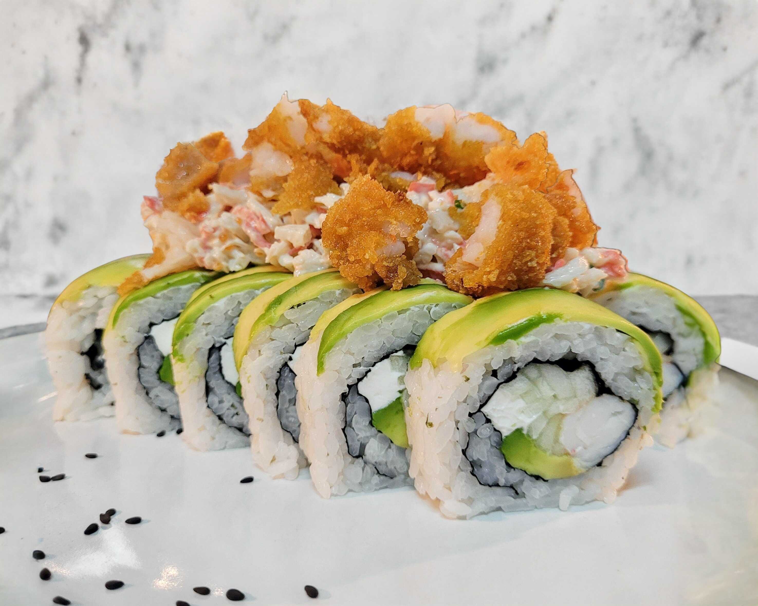 Rollo capeado con pasta picosa, coronado con camarón frito, cebolla desflemada, chile, jugo de limón, aguacate y ajonjoli