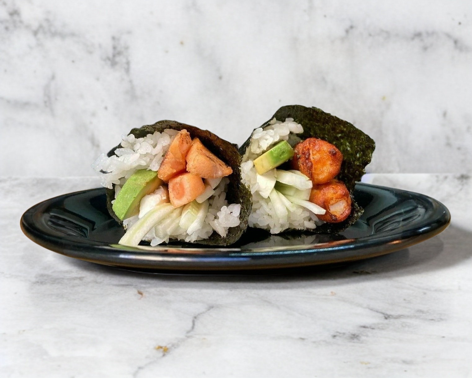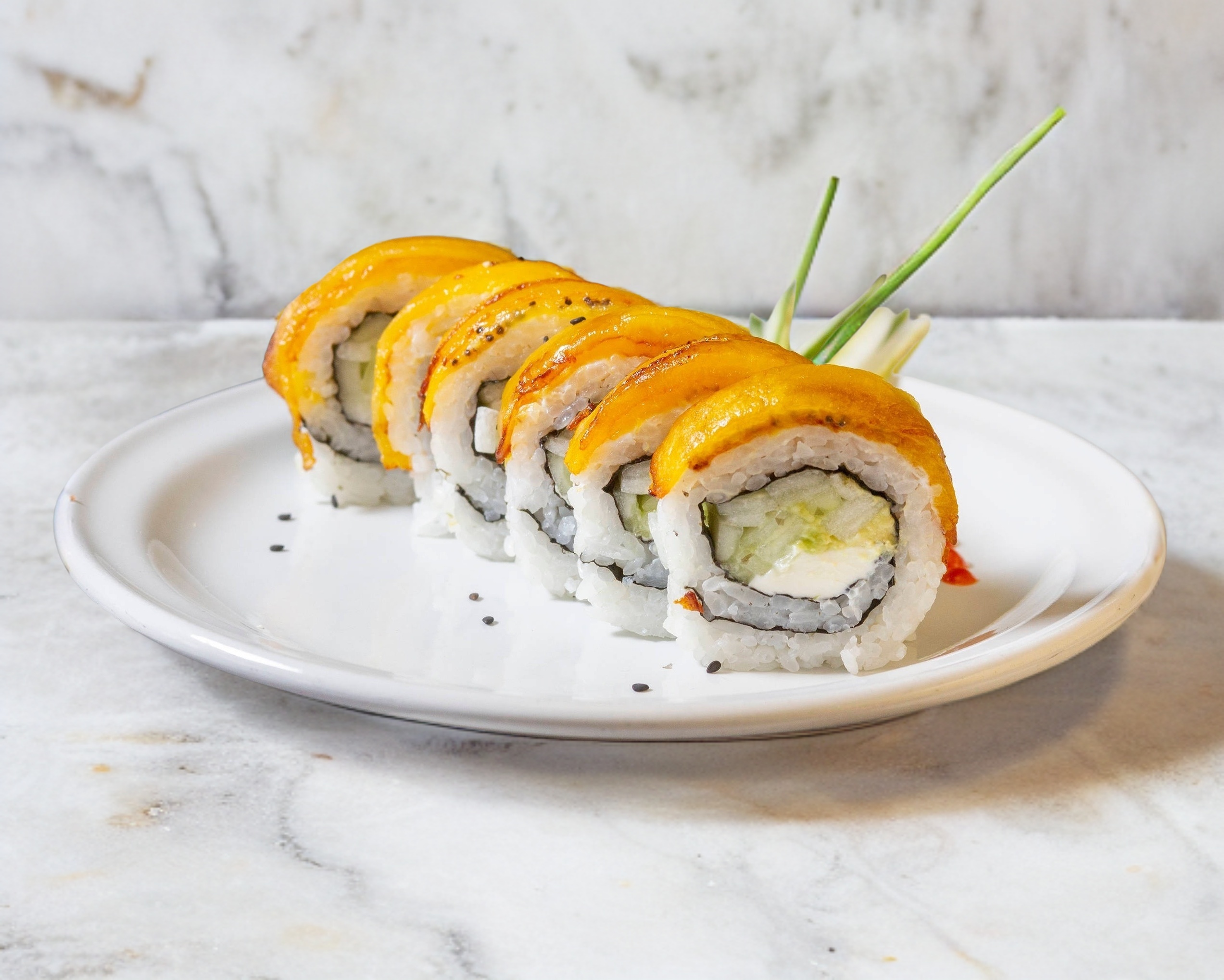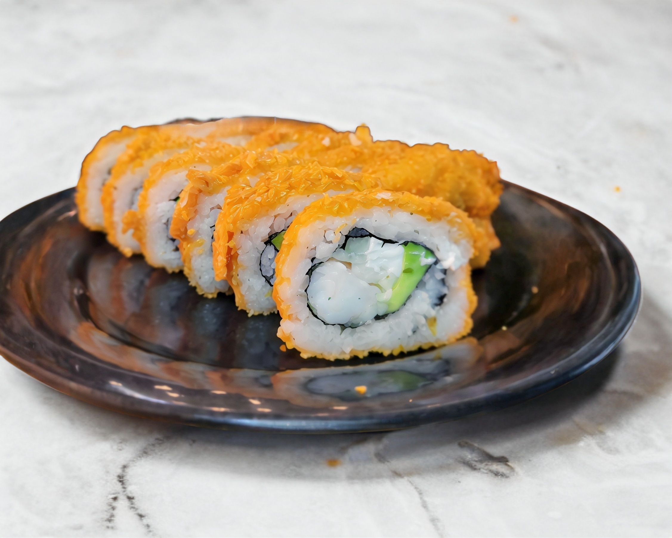 Rollo capeado con pasta picosa, coronado con camarón frito, cebolla desflemada, chile, jugo de limón, aguacate y ajonjoli