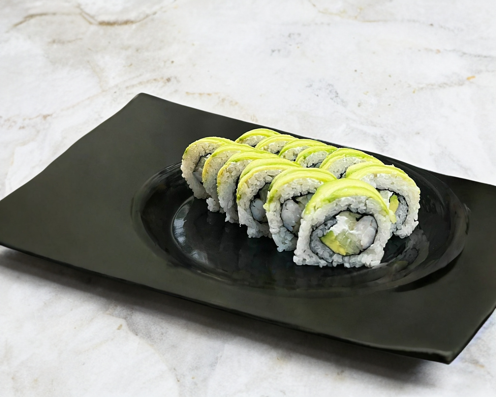 Forrado con aguacate,coronado con ensalada de surimi y camarones empanizados