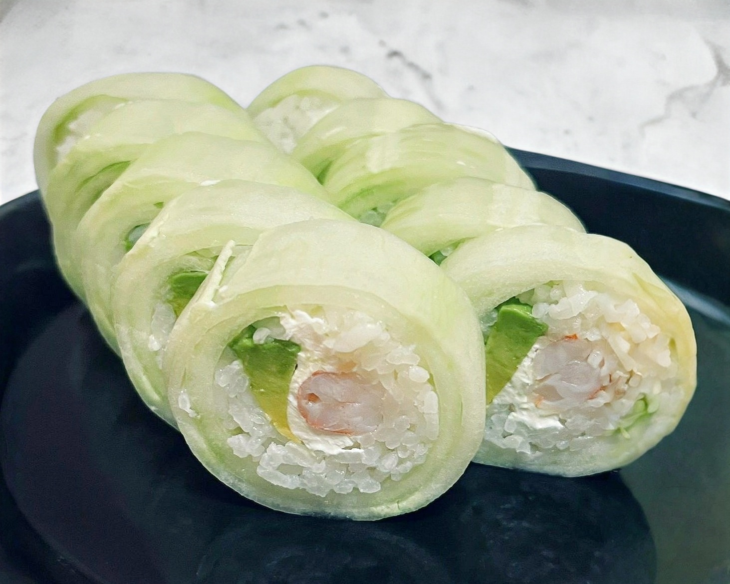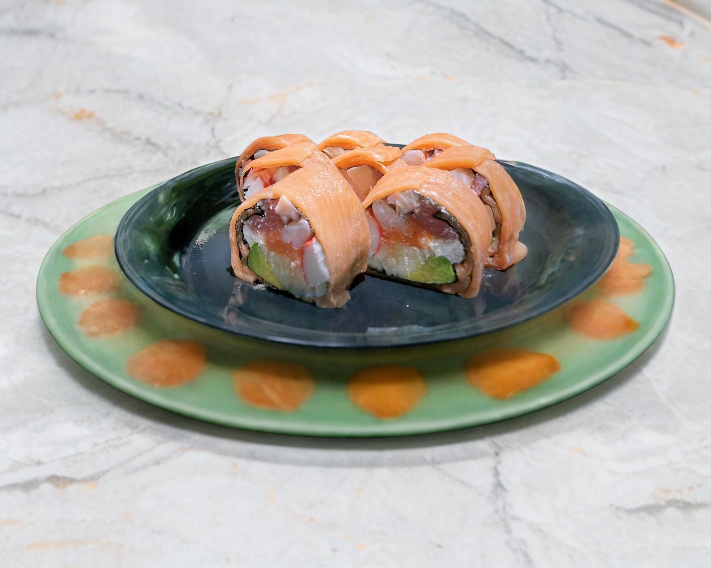 Sushi de 8 Bocados sin arroz, forrado de salmón y por dentro con todos los mariscos de la casa, aguacate,pepino y philadelphia