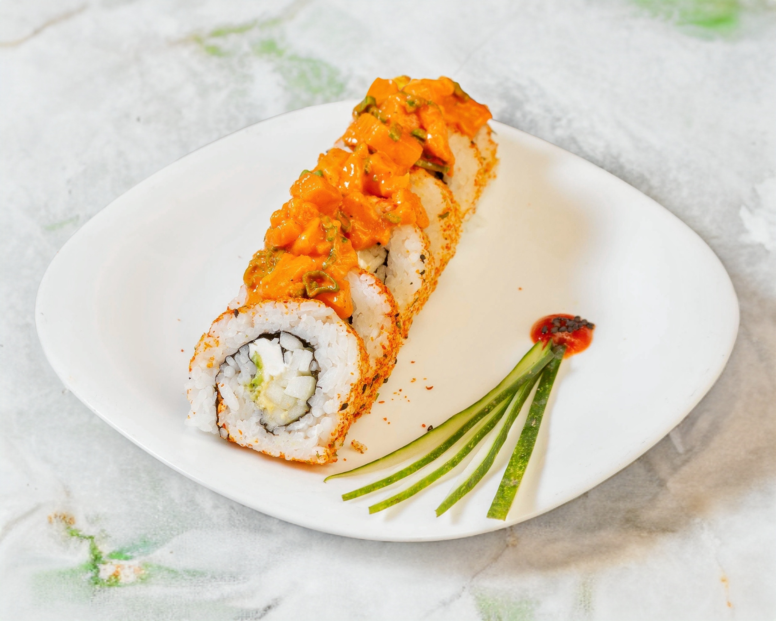 Sushi espolvoreado de sichimi coronado con aderezo de salmón picoso