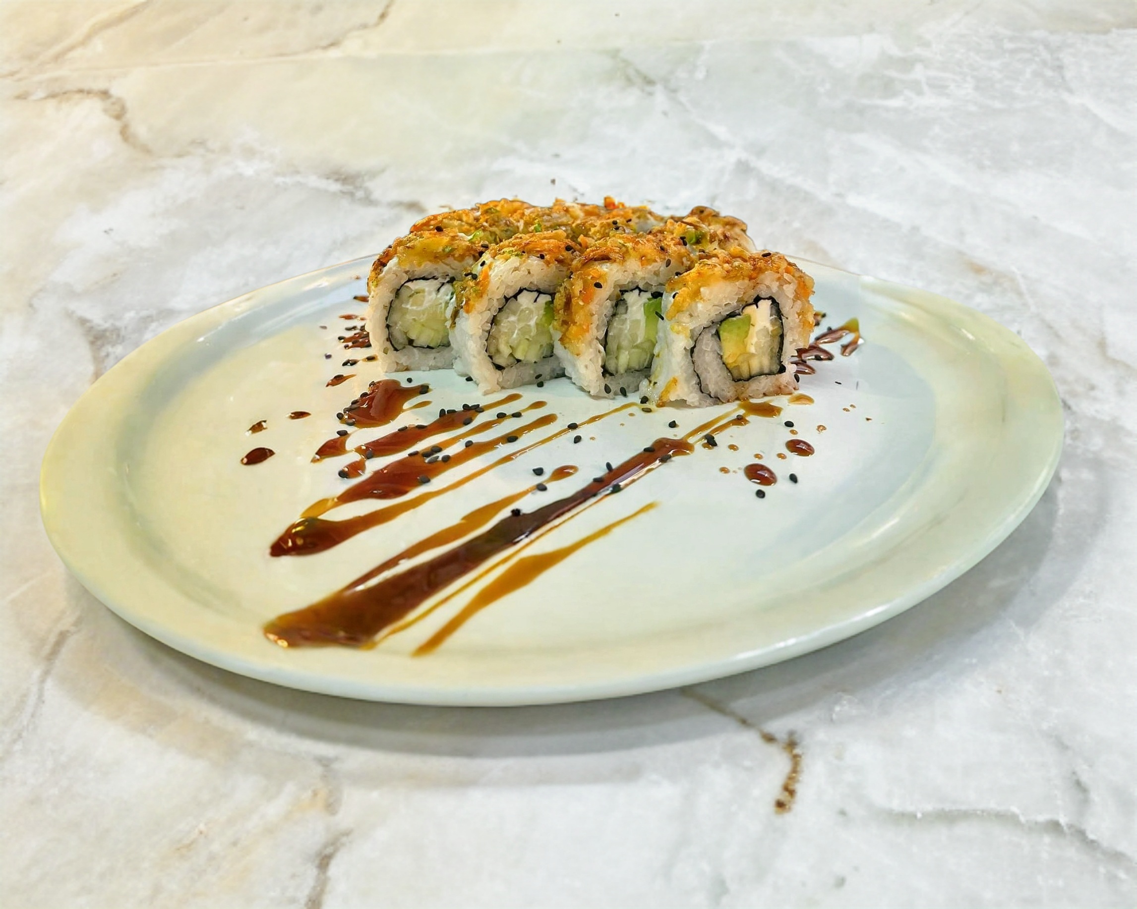 Forrado de camarón,bañado con aderezo de masago,salsa de anguila y ajonjoli,coronado con camarones empanizados