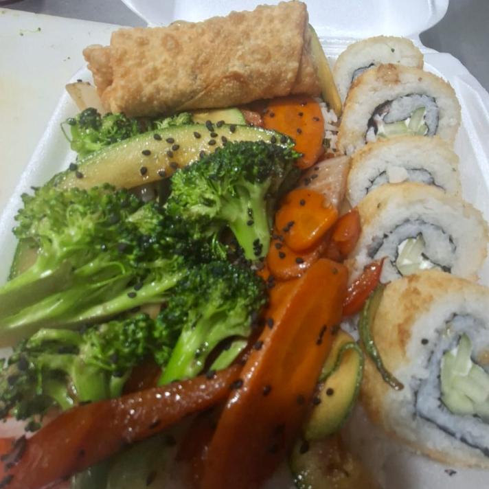 Medio sushi empanizado por fuera,por dentro relleno proteina a elegir, mas medio teriyaki ,más un rollo primavera, más una refresco pepsi