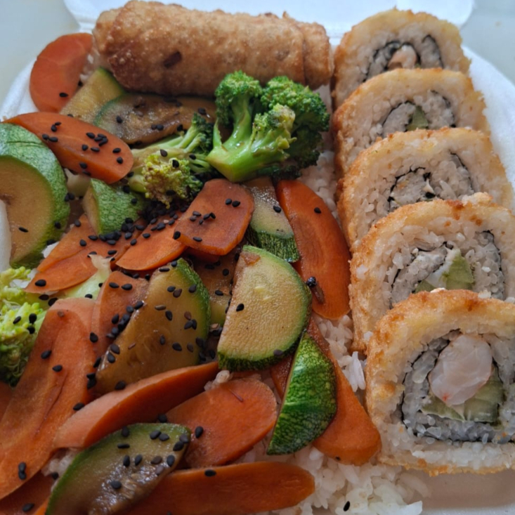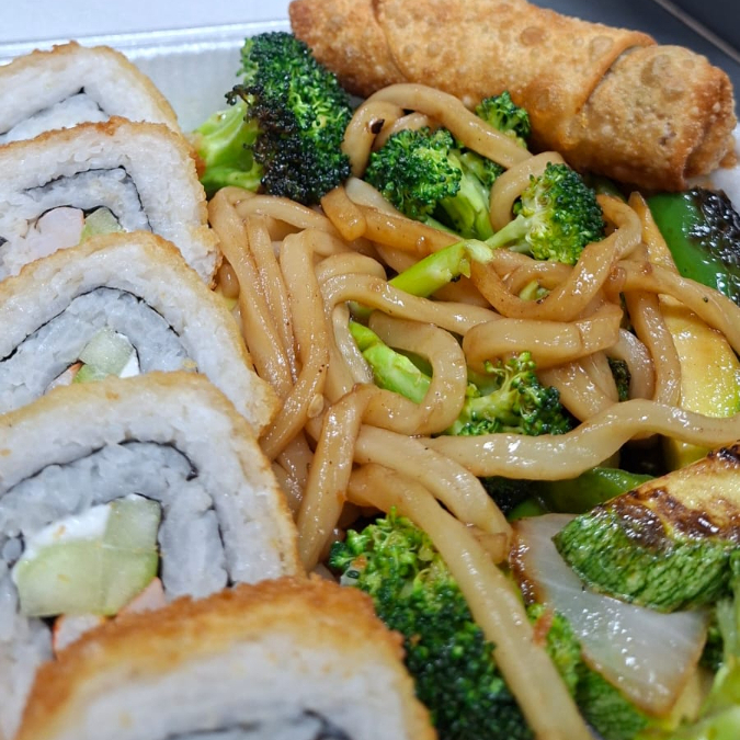 Medio sushi empanizado por fuera,por dentro relleno de proteina a elegir, medio yakisoba , mas un rollo primavera, mas un refresco pepsi