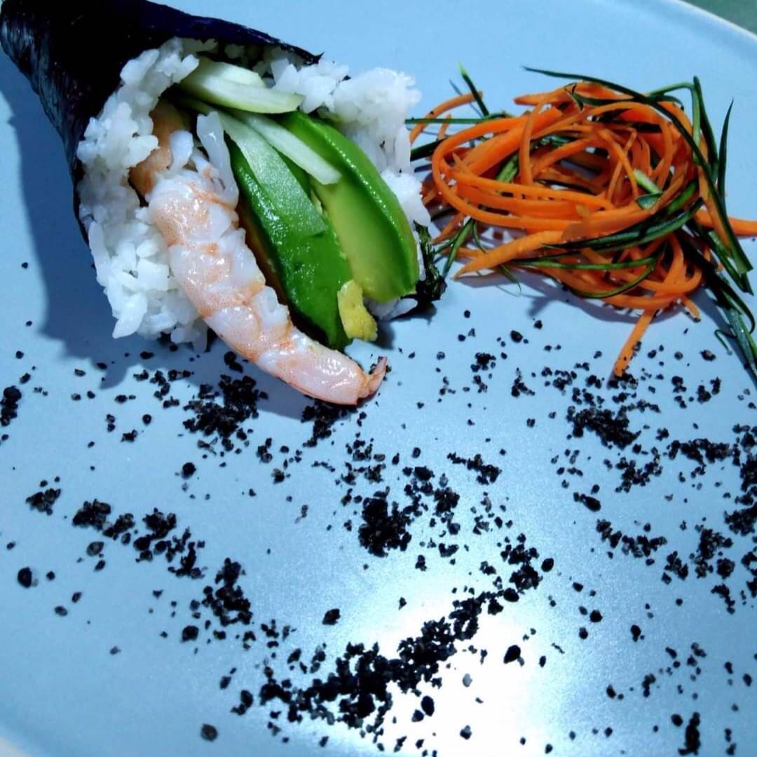 Cono de arroz envuelto en alga,relleno por dentro de pepino, aguacate, Philadelphia y proteína a elegir