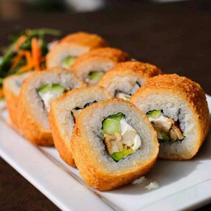 Sushi empanizado por fuera, por dentro relleno de pollo,res,y camaron pepino,philadelphia, cubierto de tampico, tocino y cebollin