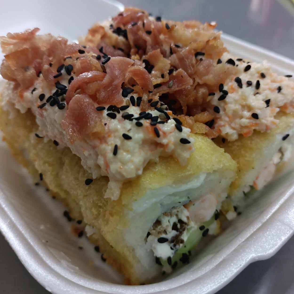 Sushi empanizado con tocino, por dentro pepino, philadelphia, pollo, res, camaron, coronado con tampico, trozos de tocino